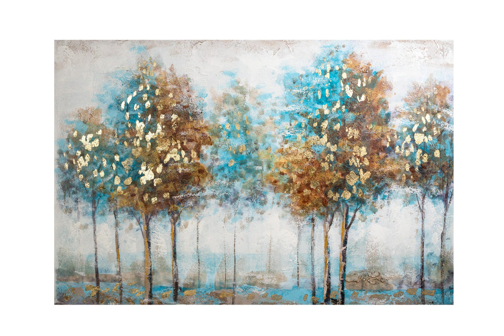 Agregue un toque de atractivo natural con textura dorada y turquesa metálica sobre canvas, con un paisaje impresionista.
